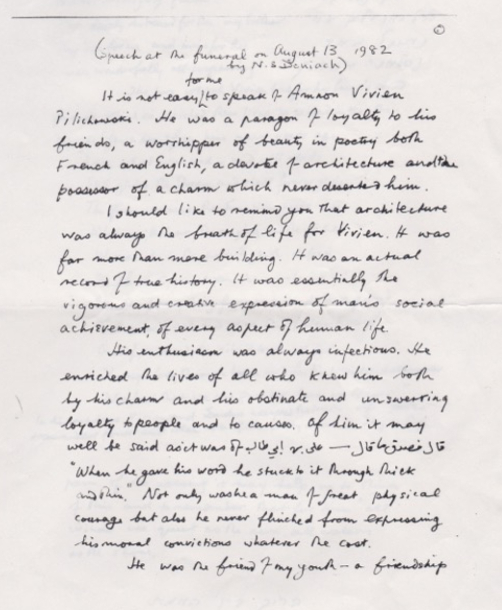 “It is not easy for me to speak of Amnon Vivien Pilichowski. He was a paragon of loyalty to his friends, a worshipper of beauty in poetry both French and English, a devotee of architecture and the possessor of a charm which never deserted him.